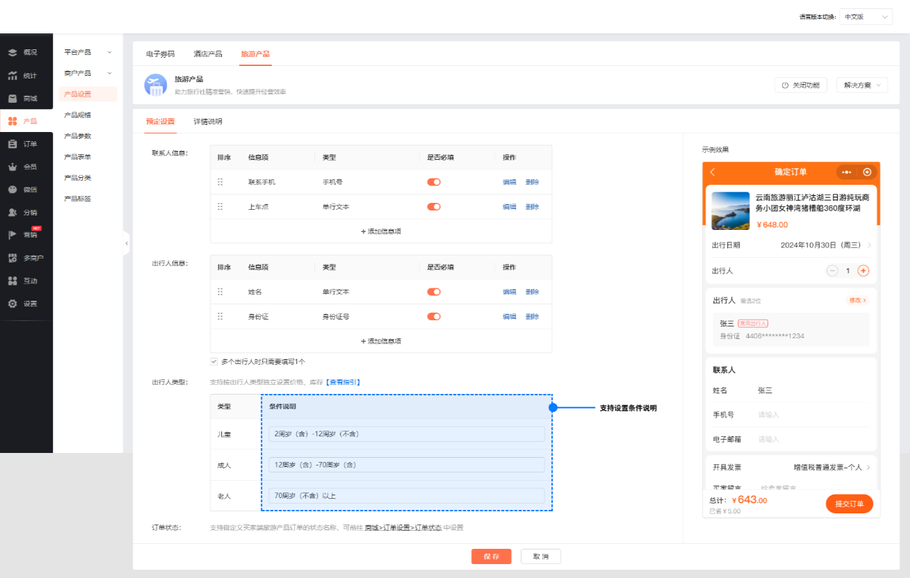 前往商城后台【产品-产品类型-旅游产品】,为不同出行人类型设置条件说明文案: