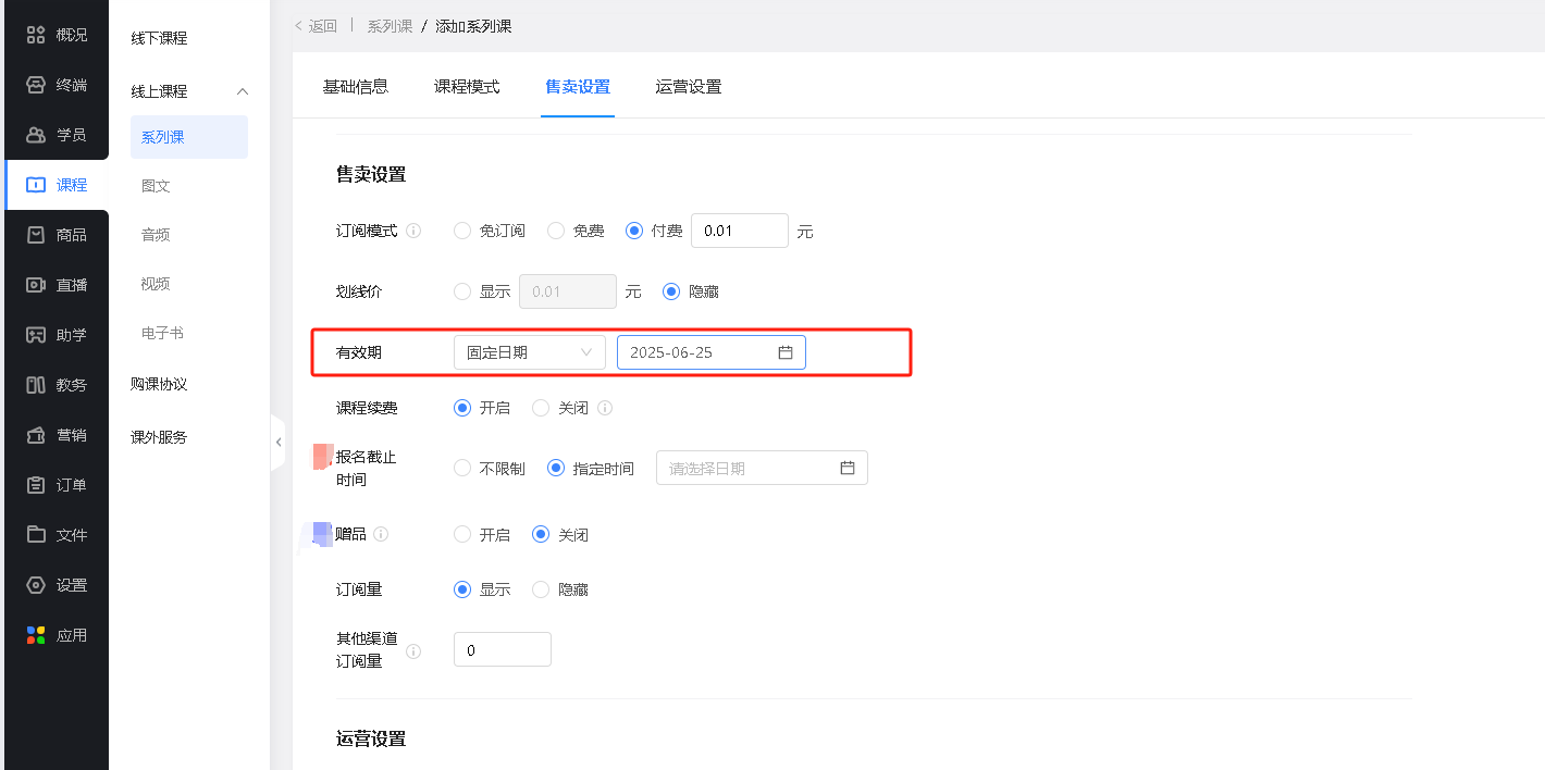 《教育型网站》产品升级更新——【线上课】课程有效期支持固定日期: 作者:范如乐 更新时间:2025-08-29 17:59 《教育型网站》产品升级更新——【线上课】课程有效期支持固定日期: [使用场景] 一些考试培训场景是固定日期的,课程有效期跟随考试固定日期,更符合实际业务需求 [功能说明] 【版本】初级版 [功能描述] 支持范围:系列课、图文、音频、视频 转载时需注明来源!首发网站:如乐建站之家;原文网址:https://www.rulejianzhan.com/update/15750.html