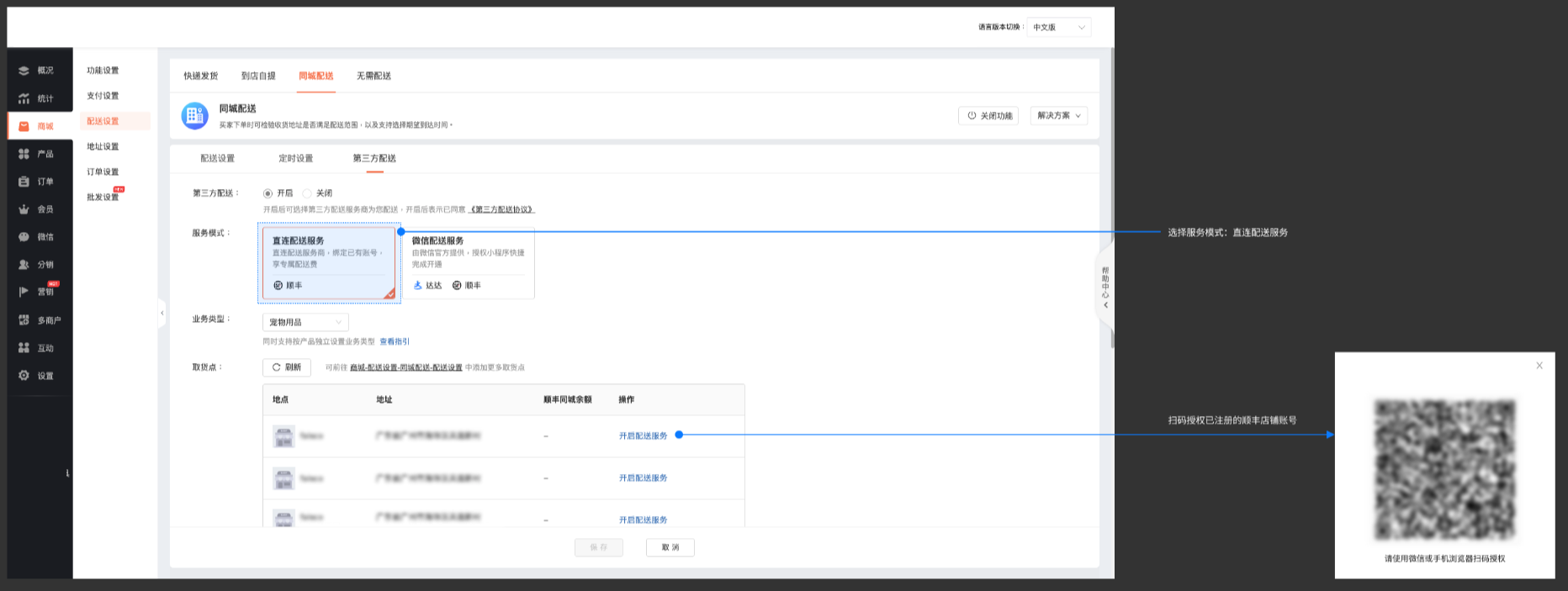 前往商城后台【商城-配送设置-同城配送-第三方配送】,启用【直连配送服务】并对取货点授权顺丰店铺账号: