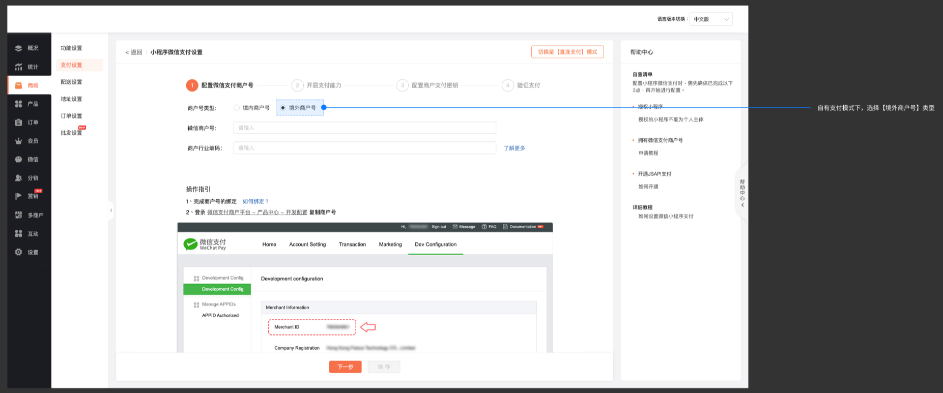注:需先联系客服单独配置,才能绑定境外微信支付商户号