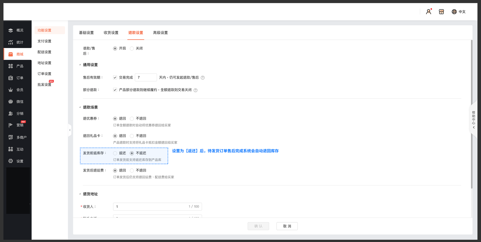 《商城型网站》产品升级更新——待发货订单售后支持退回库存: 作者:范如乐 更新时间:2025-11-15 17:51 《商城型网站》产品升级更新——待发货订单售后支持退回库存: 【场景说明】 支持待发货订单售后完成时返还库存到产品库,帮助商家快捷完成售后入库,提升商城经营效率。 【功能说明】 前往商城后台【商城-功能设置-退款设置-退款场景】,可启用【发货前退库存】: 注:如同时启用”产品部分退款则继续履约,全额退款则交易关闭”,则待发货订单需全额退款才会退库存 转载时需注明来源!首发网站:如乐建站之家;原文网址:https://www.rulejianzhan.com/update/15897.html