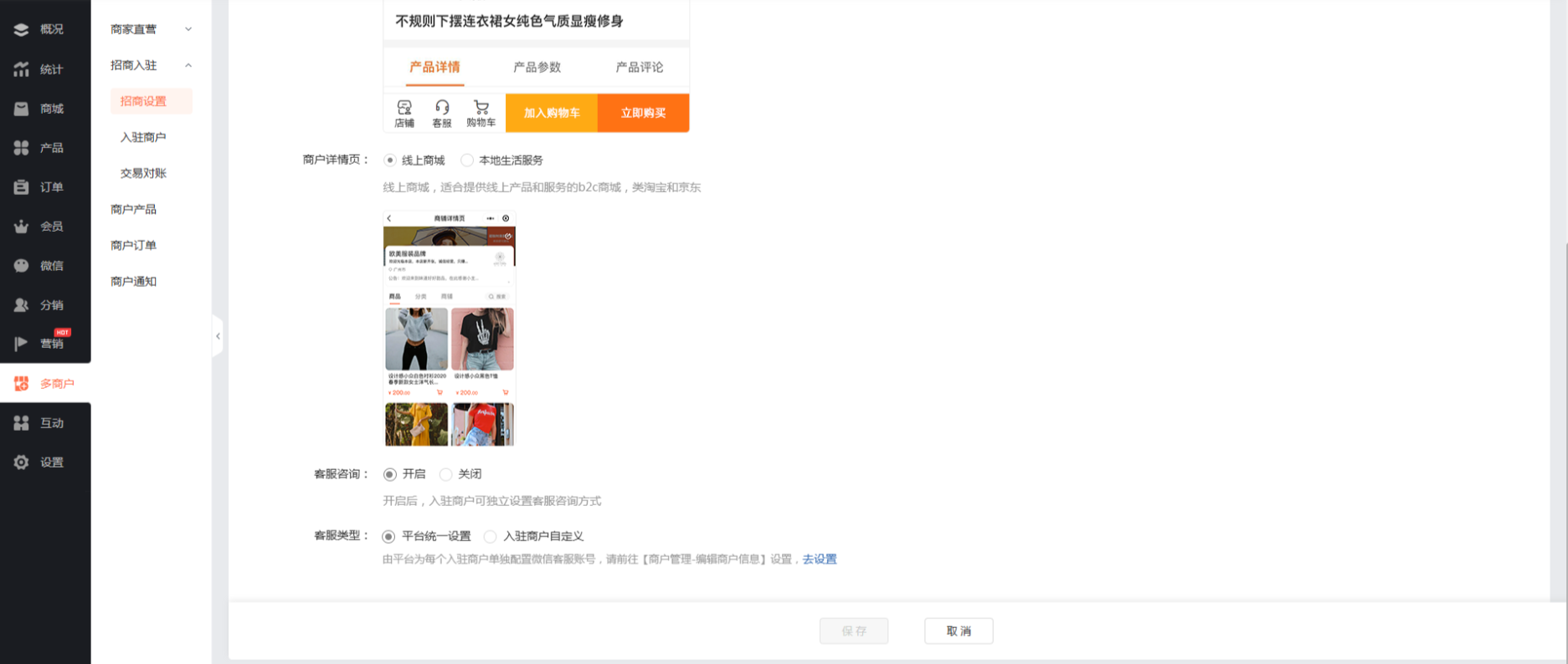 商城后台:在【招商设置】-【展示设置】-【客服类型】中选择【平台统一设置】