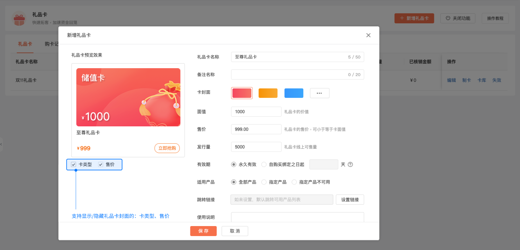 《商城型网站》产品升级更新——礼品卡支持隐藏卡类型、售价文案: 作者:范如乐 更新时间:2025-11-19 23:00 《商城型网站》产品升级更新——礼品卡支持隐藏卡类型、售价文案: 【 功能说明】 支持商家按需显示或隐藏礼品卡的卡类型、售价文案,灵活适配不同卡面设计。 【功能说明】 前往商城后台【营销-礼品卡】,新增或编辑礼品卡时,支持显示/隐藏卡类型、售价文案: 转载时需注明来源!首发网站:如乐建站之家;原文网址:https://www.rulejianzhan.com/update/15909.html
