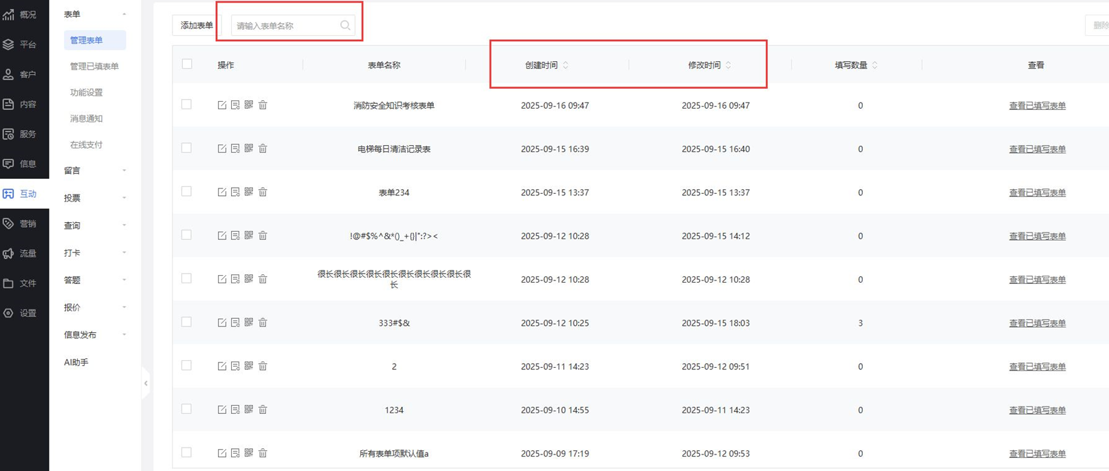 表单管理 新增支持名称搜索、创建时间排序、修改时间排序
