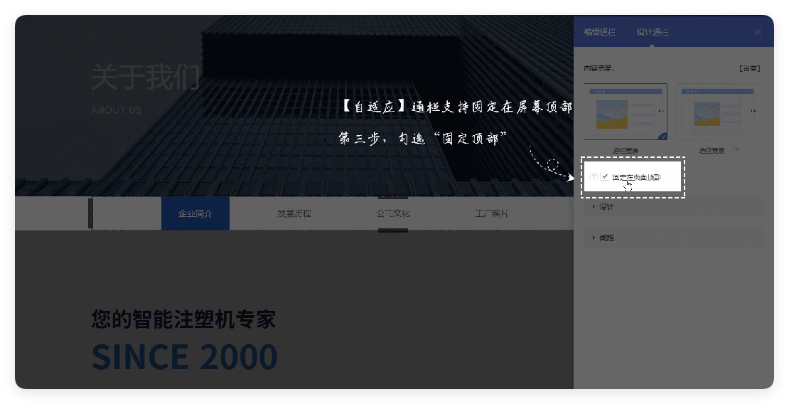 《展示型网站》产品升级更新——【自适应】通栏支持固定在屏幕顶部: 作者:范如乐 更新时间:2025-12-28 12:10 《展示型网站》产品升级更新——【自适应】通栏支持固定在屏幕顶部: 【支持端口】自适应站点 【使用场景】 新增支持通栏固定在屏幕顶部,优化锚点视觉体验,提升长页面导航效率。 【详细说明】 1、点击编辑通栏,再点击设计通栏。 2、点击启用“固定在页面顶部”即可实现效果 转载时需注明来源!首发网站:如乐建站之家;原文网址:https://www.rulejianzhan.com/update/15993.html