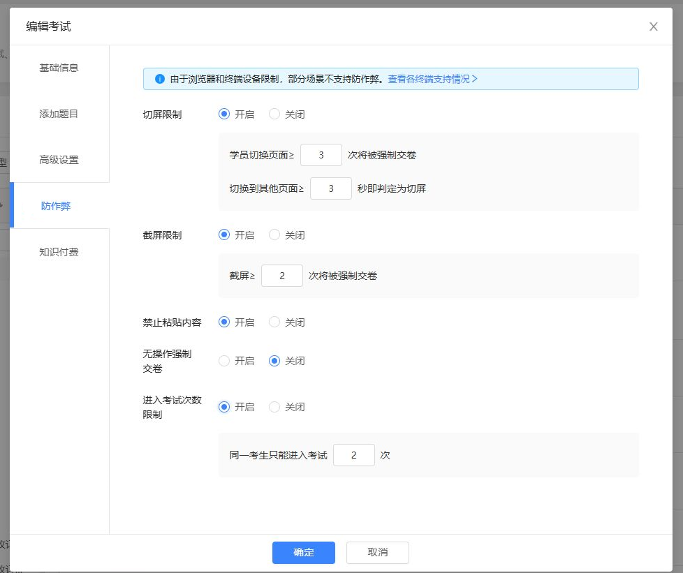 支持防切屏、防截屏、禁止粘贴、无操作强制交卷、进入考试次数限制五项防作弊功能;