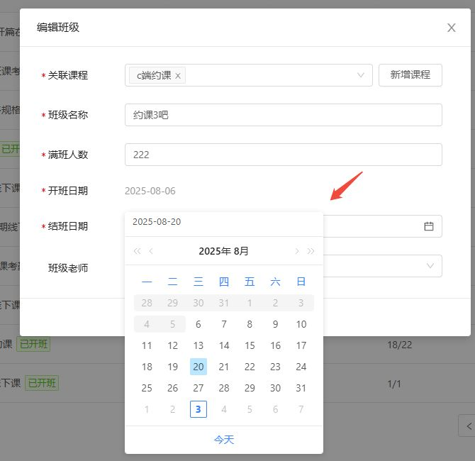 编辑班级-支持修改班级结班时间,若修改结班时间小于当前日期,将会直接结班。