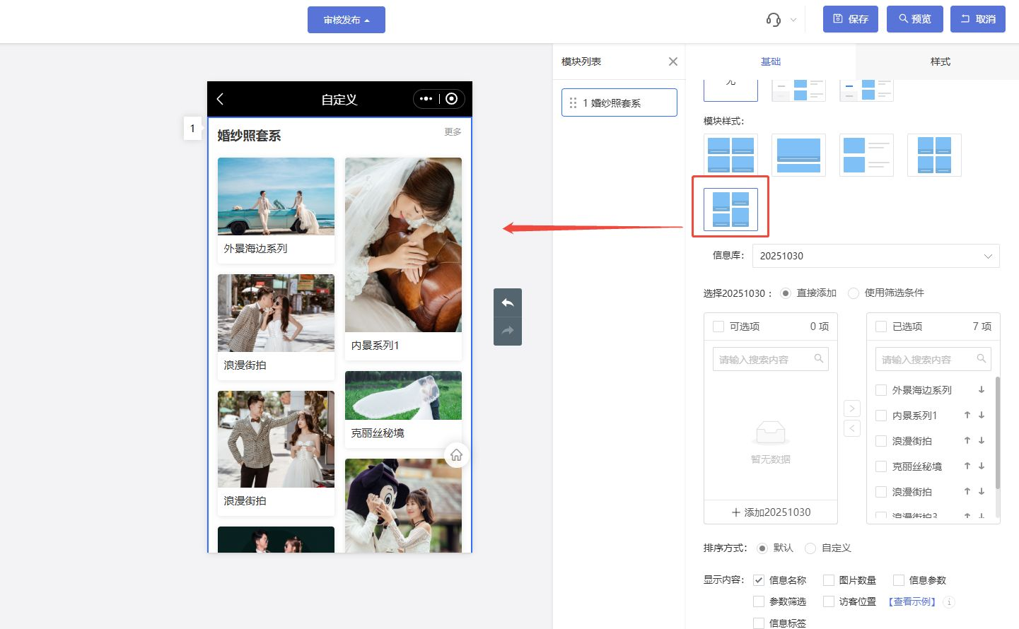 信息库模块新增样式:竖向两列排版、瀑布流样式如下,常见写真馆、婚纱摄影等样片客片展示使用: