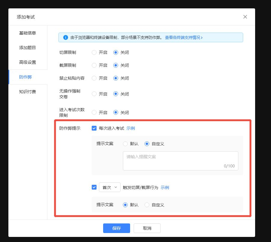 《教育型网站》产品升级更新——【考试】防作弊功能新增防作弊提醒: