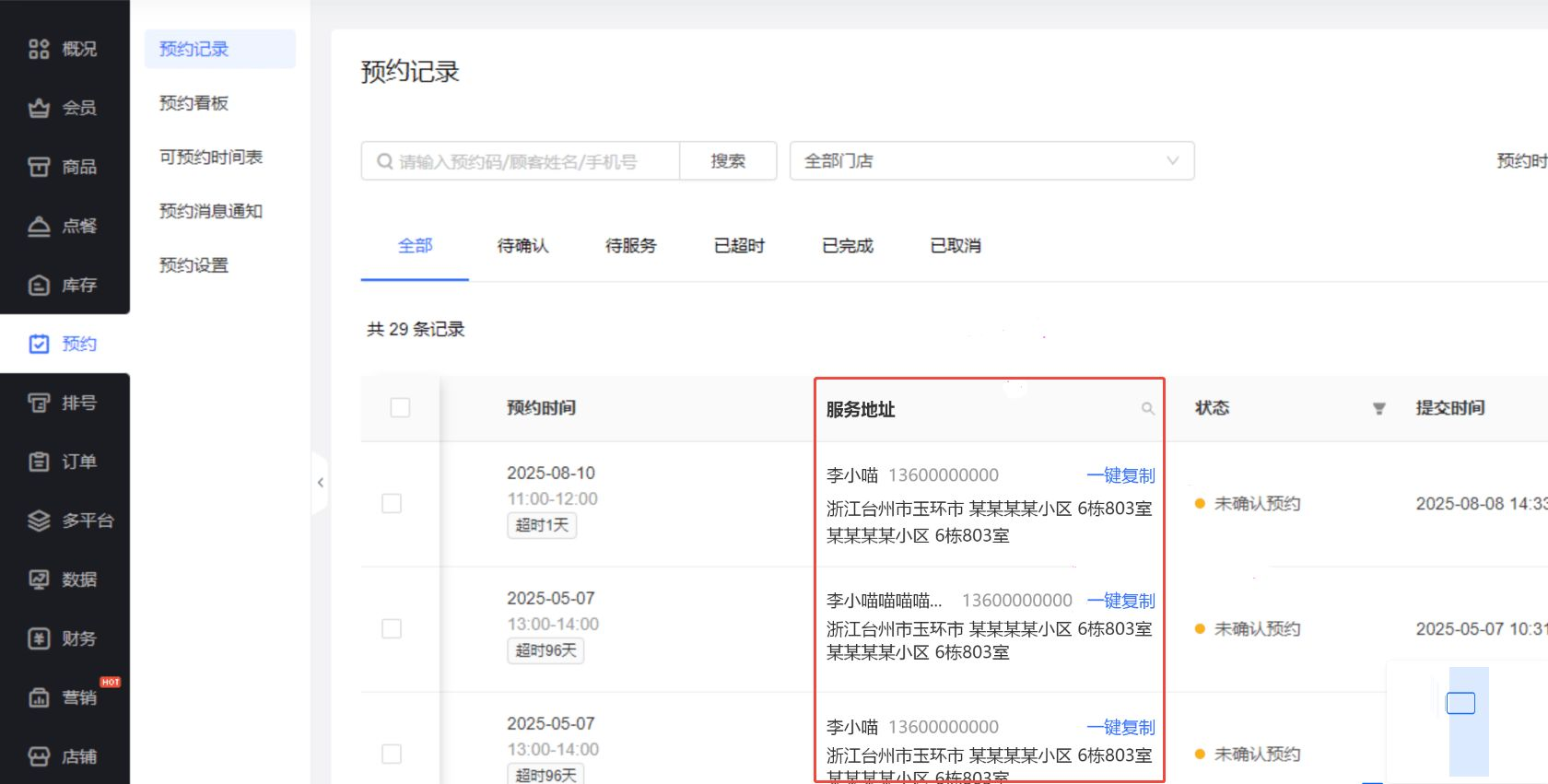 《门店系统》产品升级更新——预约列表支持查看服务地址: