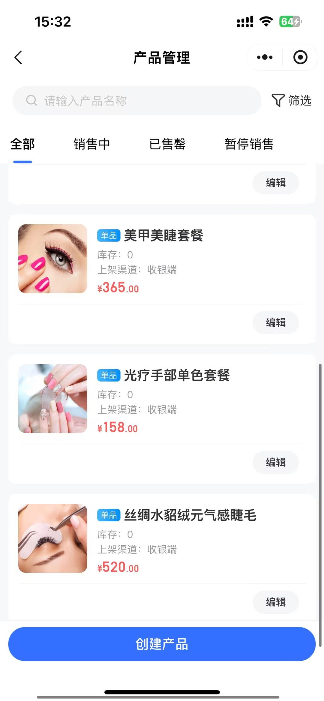 美业门店可在商家移动端创建美甲款式、护肤套餐等产品,设置名称、价格、服务时长、详情图等关键信息,实时上架至会员端售卖。